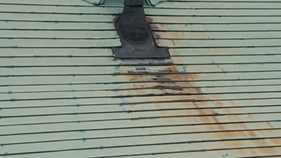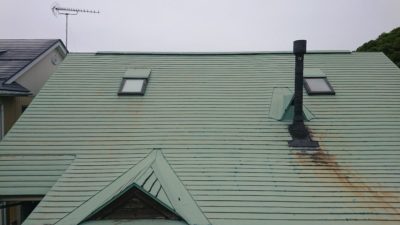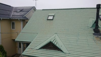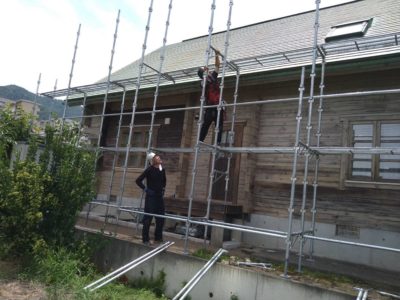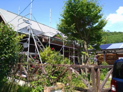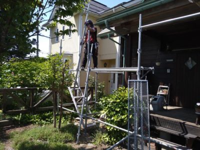 急な屋根なので、安全防止の為足場を組みました(自社掛け)